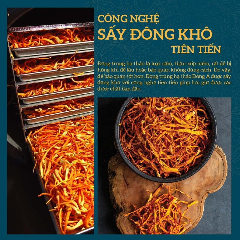 • Đông trùng hạ thảo Dược Quý Đường được chế biến theo công nghệ sấy Đông khô – công nghệ chế biến dược liệu hiện đại nhất thế giới hiện nay, cho phép bảo toàn 100% dược chất.